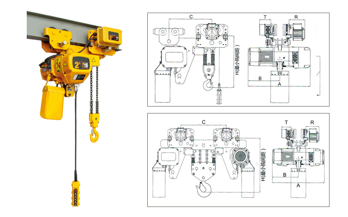 低凈空環(huán)鏈電動葫蘆適用于廠房高度較低又對提升高度有嚴格要求的工作場所使用,尤其適用于臨時搭建的廠房內(nèi)或者在其內(nèi)需要擴大有效起升空間的場所。低凈空環(huán)鏈電動葫蘆由2個跑車以及一個電動主機組合而成。